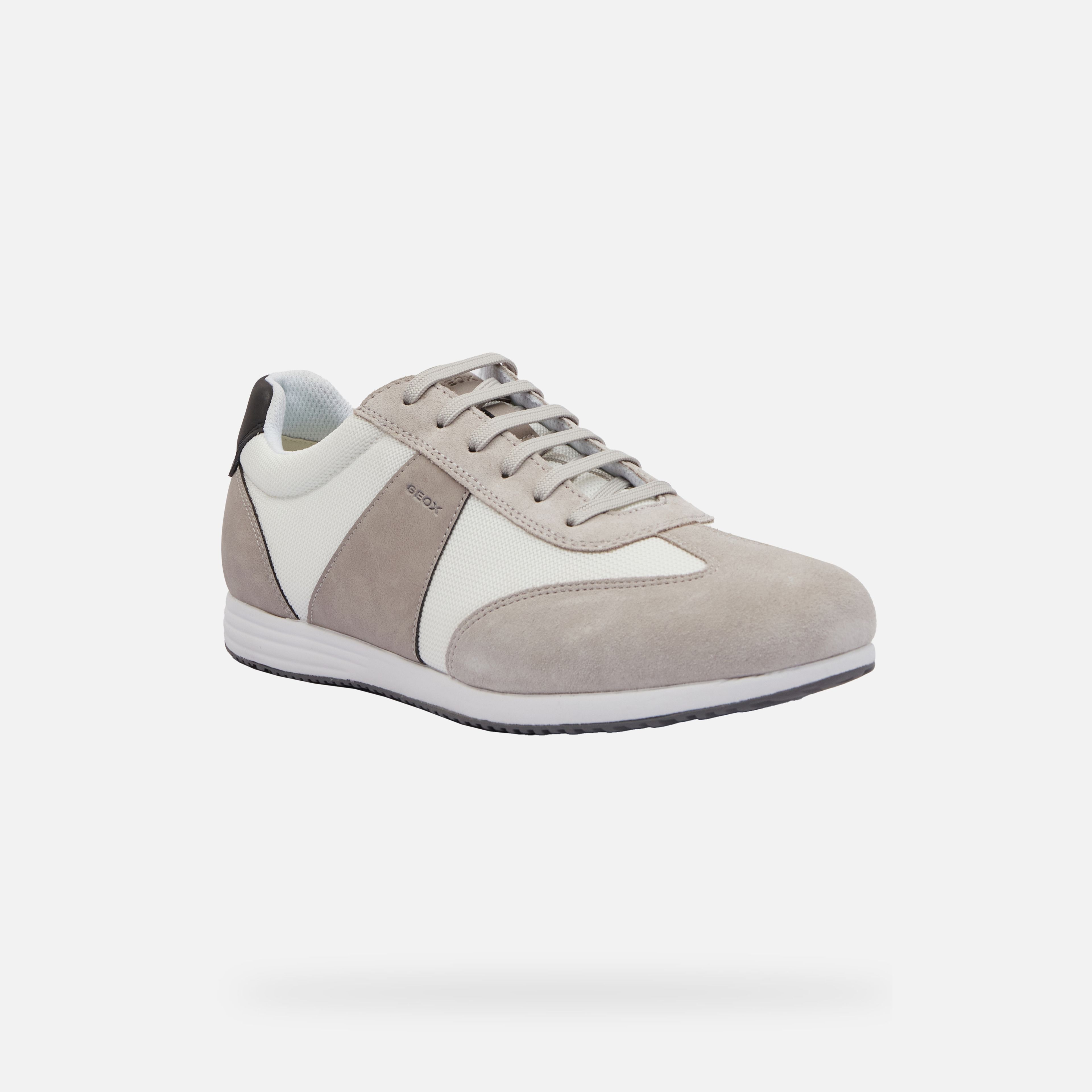 Stylové pánské tenisky Geox Arthien v bílém provedení s béžovými a světle taupovými detaily. Moderní design je tvořen geometrickými panely z prodyšné síťoviny a jemného semišu, které vytváří elegantní a nadčasový vzhled.