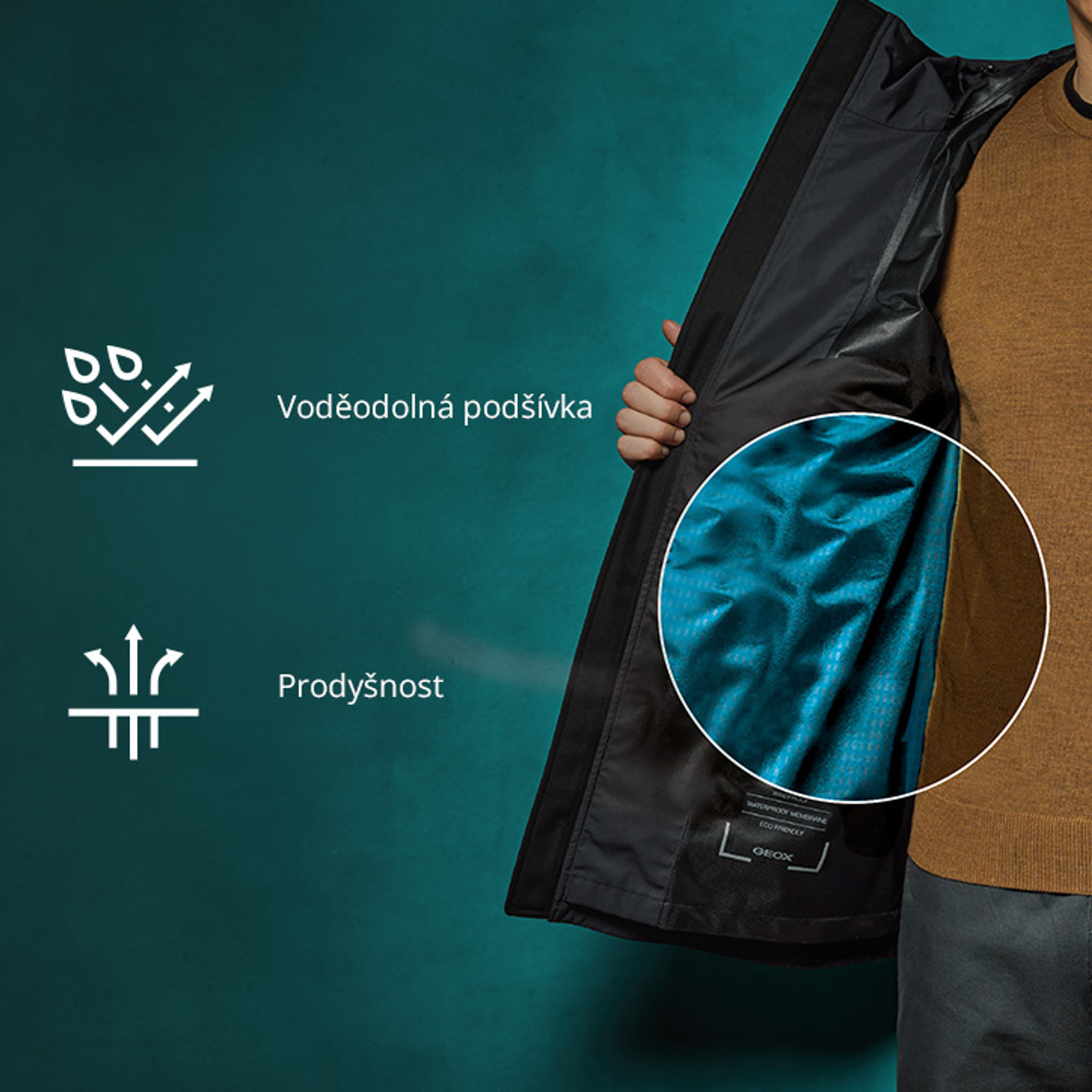Technologie Amphibiox™ v oblečení Geox zajišťuje spolehlivou ochranu proti dešti a větru díky speciální voděodolné membráně a prodyšným pásům na ramenou. Laboratorní testy potvrzují až o 40 % vyšší prodyšnost oproti běžným materiálům. Systém vytváří optimální mikroklima, reguluje teplotu a odvádí vlhkost, zatímco účinně chrání před nepříznivým počasím.
