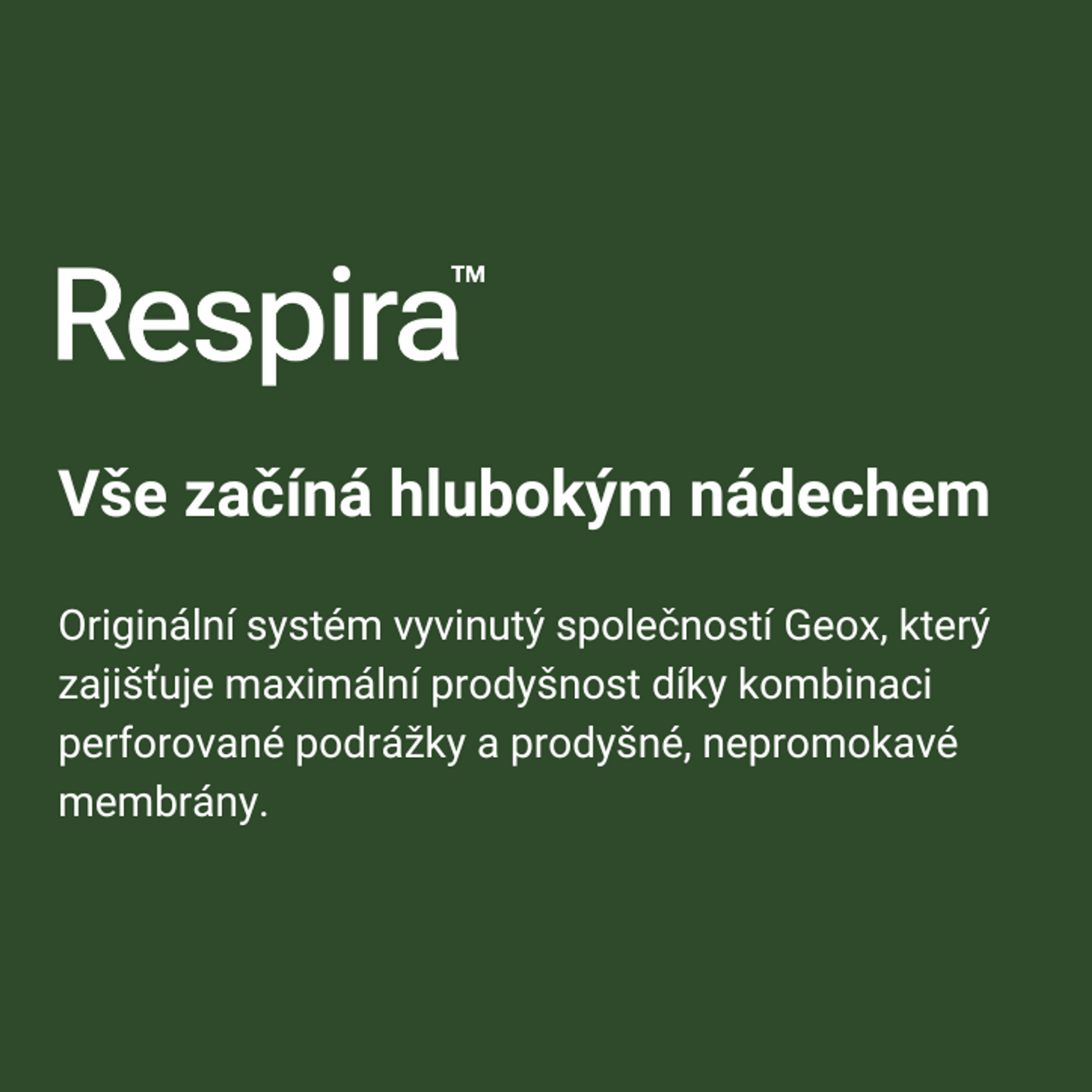 Patentovaná technologie Respira™ využívá speciální mikroporézní membránu v perforované podrážce, která aktivně odvádí vlhkost z bot ven a současně brání pronikání vody dovnitř. Díky důmyslnému systému ventilace vzniká uvnitř boty optimální mikroklima - nohy zůstávají suché a ve správné teplotě po celý den.